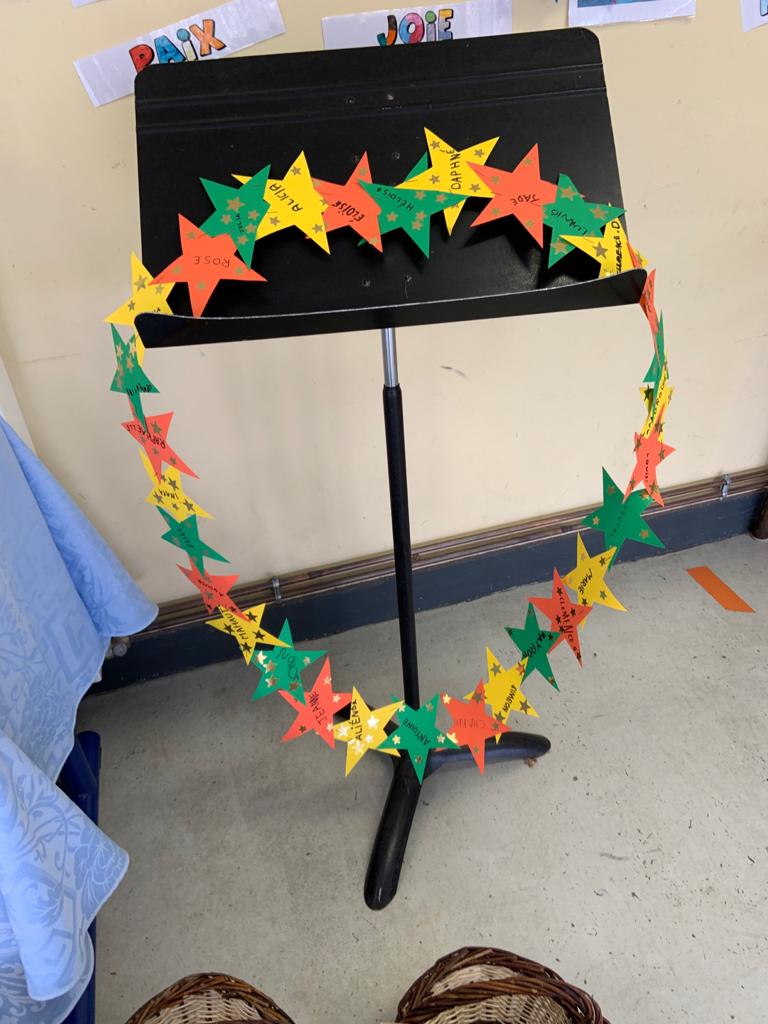 Depuis le 30 novembre 2020, toutes les classes étaient en route sur le chemin de l’AVENT avec différentes missions : vivre ce temps de l’AVENT chaque semaine en classe en apprenant différents chants qui allaient être repris lors des temps de prière du samedi 12 décembre, en priant , en ouvrant les fenêtres de leur calendrier de l’AVENT, en préparant une couronne de l’AVENT avec tous les élèves de chaque classe et en écrivant un message ou en faisant un dessin pour les personnes âgées isolées de FONDETTES dans le cadre de notre association avec l’antenne ST Vincent de Paul de FONDETTES.