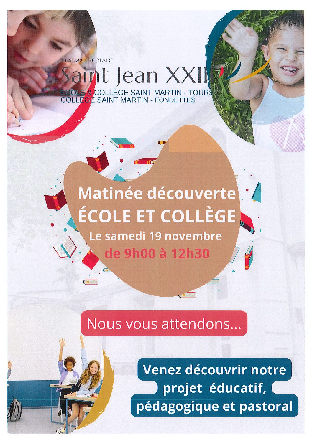 Madame, Monsieur, Notre matinée Portes Ouvertes aura lieu le samedi 23 mars 2024 de 9h00 à 12h30. Venez découvrir notre projet éducatif, pastoral et pédagogique. Nous vous attendons !