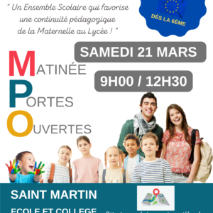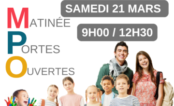 Notre matinée Portes Ouvertes aura lieu le samedi 21 mars de 9h00 à 12h30. Venez découvrir notre projet éducatif, pastoral et pédagogique. Nous vous attendons !